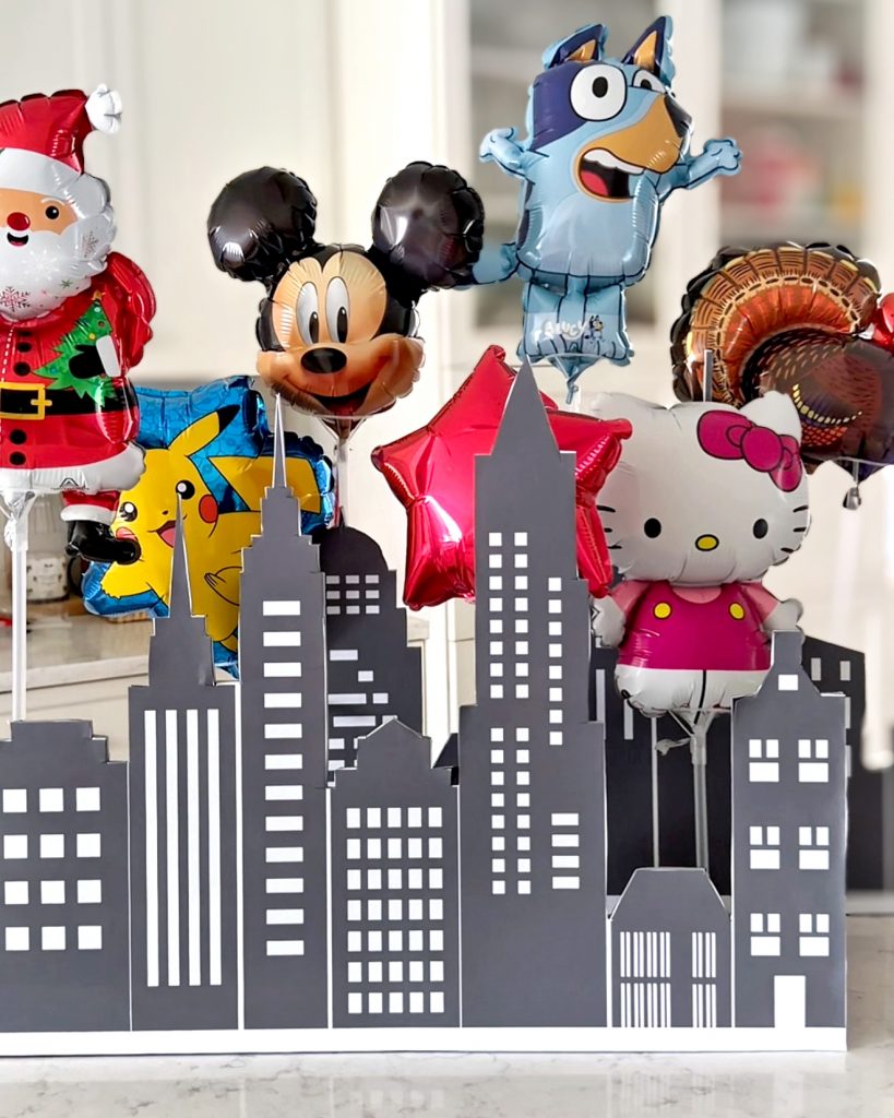 My favorite part is the fun idea to use mini foil balloons to set up a tabletop parade. You can sometimes find these little character foil balloons at the party, grocery, or even dollar store. I ordered mine online from BargainBalloons.com so that I could find a few of the kids’ favorite characters for our parade! I attached them to balloon sticks from Dollar Tree and used gaffer tape to attach them to the city building centerpiece.